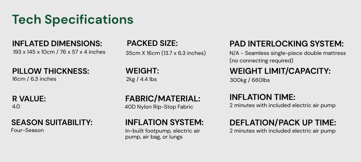 The Summit Nest Mattress Pro Double™ delivers generous sleeping space for two at 193 x 145 x 10 cm (76 x 57 x 4 inches) when fully inflated - that's a proper seamless double bed in the outdoors. It packs down to a surprisingly compact 35 x 16 x 16 cm (13.7 x 6.3 x 6.3 inches) that won't dominate your camping kit. At just 2kg (4.4 lbs), it's remarkably portable for a full double mattress built for serious adventurers.