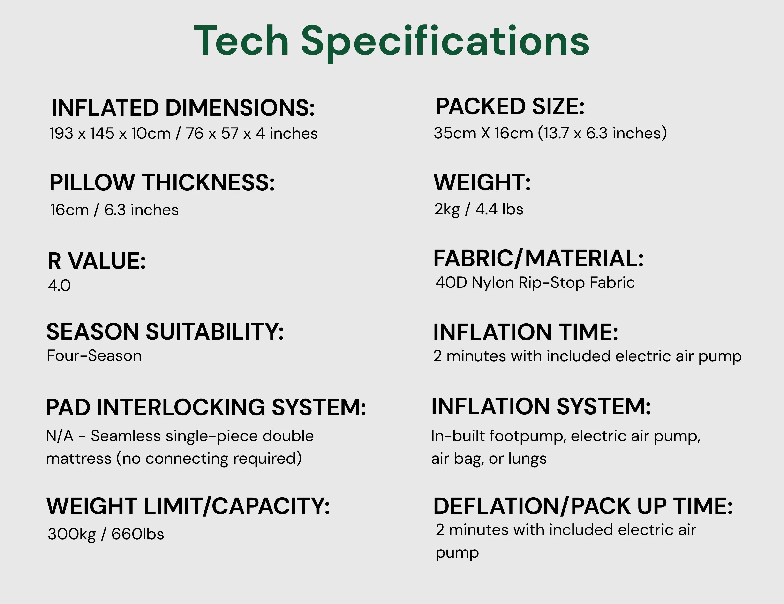 Built tough for real-world use, the Summit Nest Gear Mattress Pro Double™ easily supports over 300kg (660+ lbs) thanks to its reinforced 40D Rip-Stop construction that distributes weight evenly across the entire surface.